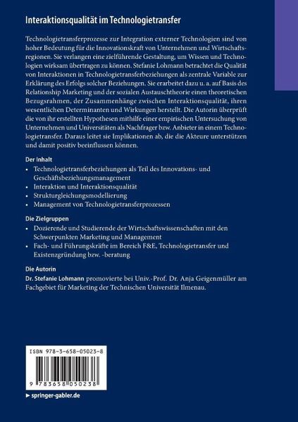Technologietransferprozesse zur Integration externer Technologien sind von hoher Bedeutung für die Innovationskraft von Unternehmen und Wirtschaftsregionen. Sie verlangen eine zielführende Gestaltung, um Wissen und Technologien wirksam übertragen zu können. Stefanie Lohmann betrachtet die Qualität von Interaktionen in Technologietransferbeziehungen als zentrale Variable zur Erklärung des Erfolgs solcher Beziehungen. Sie erarbeitet dazu u. a. auf Basis des Relationship Marketing und der sozialen Austauschtheorie einen theoretischen Bezugsrahmen, der Zusammenhänge zwischen Interaktionsqualität, ihren wesentlichen Determinanten und Wirkungen herstellt. Die Autorin überprüft die von ihr erstellten Hypothesen mithilfe einer empirischen Untersuchung von Unternehmen und Universitäten als Nachfrager bzw. Anbieter in einem Technologietransfer. Daraus leitet sie Implikationen ab, die die Akteure unterstützen und damit positiv beeinflussen können.