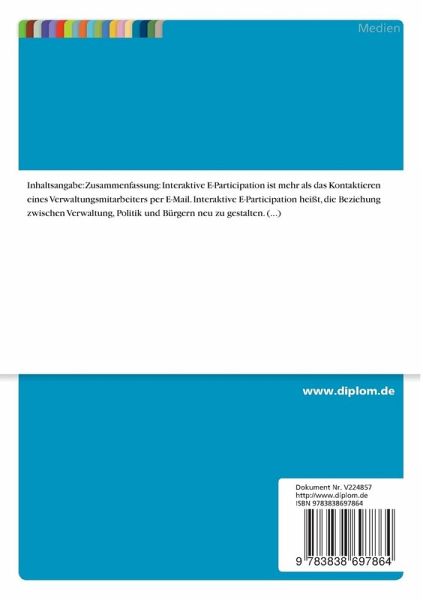 Interaktive E-Participation ist mehr als das Kontaktieren eines Verwaltungsmitarbeiters per E-Mail. Interaktive E-Participation heißt, die Beziehung zwischen Verwaltung, Politik und Bürgern neu zu gestalten. Die politisch beschlossenen Inhalte von Deutschland-Online besagen, dass in jährlichen Schritten bis 2008 alle geeigneten Verwaltungsverfahren online zu Verfügung gestellt werden sollen und dann auch alle Behörden untereinander auf diesem Wege kommunizieren.