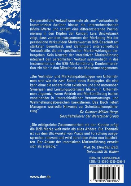 "Die erfolgreiche Zusammenarbeit mit den Kunden prägt die B2B-Marke weit mehr als alles Andere. Die Thematik ist aus dem Blickwinkel von Praxis und Forschung ausgesprochen relevant und wird durch den Autor neu beschritten. Der Ansatz der interaktiven Markenführung erweist sich als ergiebig."
