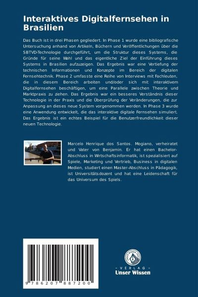 Das Buch ist in drei Phasen gegliedert. In Phase 1 wurde eine bibliografische Untersuchung anhand von Artikeln, Büchern und Veröffentlichungen über die SBTVD-Technologie durchgeführt, um die Struktur dieses Systems, die Gründe für seine Wahl und das eigentliche Ziel der Einführung dieses Systems in Brasilien aufzuzeigen. Das Ergebnis war eine Vertiefung der technischen Informationen und Konzepte im Bereich der digitalen Fernsehtechnik. Phase 2 umfasste eine Reihe von Interviews mit Fachleuten, die in diesem Bereich arbeiten und/oder sich mit interaktivem Digitalfernsehen beschäftigen, um eine Parallele zwischen Theorie und Marktpraxis zu ziehen. Das Ergebnis war ein besseres Verständnis dieser Technologie in der Praxis und die Überprüfung der Veränderungen, die zur Anpassung an dieses neue System vorgenommen werden. In Phase 3 wurde eine Anwendung entwickelt, die das interaktive digitale Fernsehen simuliert. Das Ergebnis ist ein echtes Beispiel für die Benutzerfreundlichkeit dieser neuen Technologie.