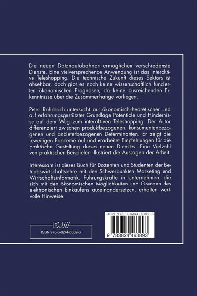 Die neuen Datenautobahnen ermöglichen verschiedenste Dienste. Eine vielversprechende Anwendung ist das interaktive Teleshopping. Die technische Zukunft dieses Sektor ist absehbar, doch gibt es noch keine wissenschaftlich fundierten ökonomischen Prognosen, da keine ausreichenden Erkenntnisse über die Zusammenhänge vorliegen. Peter Rohrbach untersucht auf ökonomisch-theoretischer und auf erfahrungsgestützter Grundlage Potentiale und Hindernisse auf dem Weg zum interaktiven Teleshopping. Der Autor differenziert zwischen produktbezogenen, konsumentenbezogenen und anbieterbezogenen Determinanten. Er zeigt die jeweiligen Probleme auf und erarbeitet Empfehlungen für die praktische Gestaltung dieses neuen Dienstes. Eine Vielzahl von praktischen Beispielen illustriert die Aussagen der Arbeit.