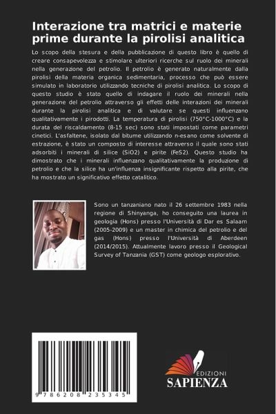 Lo scopo della stesura e della pubblicazione di questo libro è quello di creare consapevolezza e stimolare ulteriori ricerche sul ruolo dei minerali nella generazione del petrolio. Il petrolio è generato naturalmente dalla pirolisi della materia organica sedimentaria, processo che può essere simulato in laboratorio utilizzando tecniche di pirolisi analitica. Lo scopo di questo studio è stato quello di indagare il ruolo dei minerali nella generazione del petrolio attraverso gli effetti delle interazioni dei minerali durante la pirolisi analitica e di valutare se questi influenzano qualitativamente i pirodotti. La temperatura di pirolisi (750°C-1000°C) e la durata del riscaldamento (8-15 sec) sono stati impostati come parametri cinetici. L'asfaltene, isolato dal bitume utilizzando n-esano come solvente di estrazione, è stato un composto di interesse attraverso il quale sono stati adsorbiti i minerali di silice (SiO2) e pirite (FeS2). Questo studio ha dimostrato che i minerali influenzano qualitativamente la produzione di petrolio e che la silice ha un'influenza insignificante rispetto alla pirite, che ha mostrato un significativo effetto catalitico.
