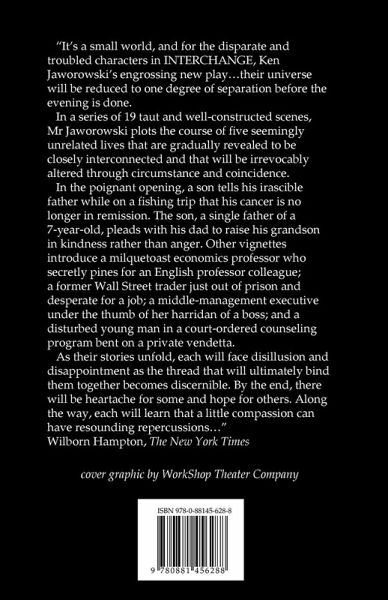 A story that focuses on life, death, and choice, draws together the lives of five seemingly disparate characters: A hard-driving businessman struggling to raise his grandson. A paroled convict hoping to find redemption. A shy college professor trying to win the approval of his students. A middle-aged office manager pressured to hide her secrets. And a haunted young man hungry for revenge. As their stories unfold in plots both tragic and comic, these desperate souls find themselves intertwined in each other's battles and dreams. "It's a small world, and for the disparate and troubled characters in INTERCHANGE, Ken Jaworowski's engrossing new play ... their universe will be reduced to one degree of separation before the evening is done. In a series of 19 taut and well-constructed scenes, Mr Jaworowski plots the course of five seemingly unrelated lives that are gradually revealed to be closely interconnected and that will be irrevocably altered through circumstance and coincidence. In the poignant opening, a son tells his irascible father while on a fishing trip that his cancer is no longer in remission. The son, a single father of a seven-year-old, pleads with his dad to raise his grandson in kindness rather than anger. Other vignettes introduce a milquetoast economics professor who secretly pines for an English professor colleague; a former Wall Street trader just out of prison and desperate for a job; a middle-management executive under the thumb of her harridan of a boss; and a disturbed young man in a court-ordered counseling program bent on a private vendetta. As their stories unfold, each will face disillusion and disappointment as the thread that will ultimately bind them together becomes discernible. By the end, there will be heartache for some and hope for others. Along the way, each will learn that a little compassion can have resounding repercussions ..." -Willborn Hampton, The New York Times