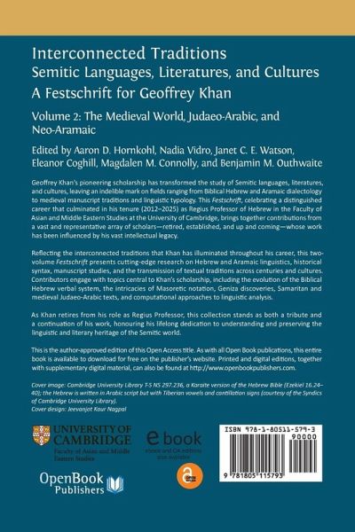 Geoffrey Khan's pioneering scholarship has transformed the study of Semitic languages, literatures, and cultures, leaving an indelible mark on fields ranging from Biblical Hebrew and Aramaic dialectology to medieval manuscript traditions and linguistic typology. This Festschrift, celebrating a distinguished career that culminated in his tenure (2012-2025) as Regius Professor of Hebrew in the Faculty of Asian and Middle Eastern Studies at the University of Cambridge, brings together contributions from a vast and representative array of scholars-retired, established, and up and coming-whose work has been influenced by his vast intellectual legacy. Reflecting the interconnected traditions that Khan has illuminated throughout his career, this two-volume Festschrift presents cutting-edge research on Hebrew and Aramaic linguistics, historical syntax, manuscript studies, and the transmission of textual traditions across centuries and cultures. Contributors engage with topics central to Khan's scholarship, including the evolution of the Biblical Hebrew verbal system, the intricacies of Masoretic notation, Geniza discoveries, Samaritan and medieval Judaeo-Arabic texts, and computational approaches to linguistic analysis. As Khan retires from his role as Regius Professor, this collection stands as both a tribute and a continuation of his work, honouring his lifelong dedication to understanding and preserving the linguistic and literary heritage of the Semitic world.