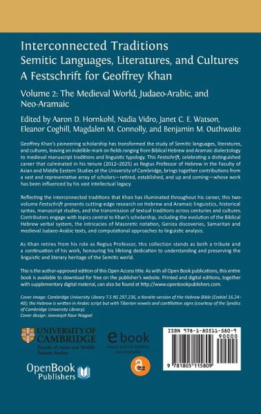Geoffrey Khan's pioneering scholarship has transformed the study of Semitic languages, literatures, and cultures, leaving an indelible mark on fields ranging from Biblical Hebrew and Aramaic dialectology to medieval manuscript traditions and linguistic typology. This Festschrift, celebrating a distinguished career that culminated in his tenure (2012-2025) as Regius Professor of Hebrew in the Faculty of Asian and Middle Eastern Studies at the University of Cambridge, brings together contributions from a vast and representative array of scholars-retired, established, and up and coming-whose work has been influenced by his vast intellectual legacy. Reflecting the interconnected traditions that Khan has illuminated throughout his career, this two-volume Festschrift presents cutting-edge research on Hebrew and Aramaic linguistics, historical syntax, manuscript studies, and the transmission of textual traditions across centuries and cultures. Contributors engage with topics central to Khan's scholarship, including the evolution of the Biblical Hebrew verbal system, the intricacies of Masoretic notation, Geniza discoveries, Samaritan and medieval Judaeo-Arabic texts, and computational approaches to linguistic analysis. As Khan retires from his role as Regius Professor, this collection stands as both a tribute and a continuation of his work, honouring his lifelong dedication to understanding and preserving the linguistic and literary heritage of the Semitic world.