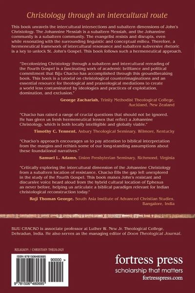 Intercultural Christology in John's Gospel unravels the intercultural intersections and subaltern dimensions of John's Christology. A hermeneutical framework of intercultural resonance and subaltern subversive rhetoric is a key to unlock the Gospel. Such a hermeneutical approach is a viable option in any subaltern context.