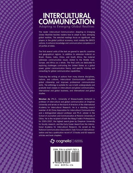 The reader Intercultural Communication: Adapting to Emerging Global Realitiesteaches readers how to adapt to new, emerging global realities. The selected readings focus on significant, new players in the global political economy, most notably the BRICS nations, to enhance knowledge and communicative competence of all parties at stake. The first several units of the text are geared to specific countries and geographical regions. In addition to extensive material on Brazil, Russia, India, China, and South Africa, the material addresses communicative issues related to the Middle East, Europe, and Africa as a whole. The final units are dedicated to exploring challenges confronting the United States as a global power, global communication theory, and specific training and consulting for global communicative capabilities. Featuring the writing of authors from many diverse disciplines, nations, and cultures, Intercultural Communication cultivates global citizenship and improves professional communication skills. The anthology is suitable for use in both undergraduate and graduate level classes in intercultural and global communication, international and global business, and international and global studies. Wenshan Jia (Ph.D., University of Massachusetts Amherst) is professor of intercultural and global communication at Chapman University and serves on the board of directors of the International Academy for Intercultural Research. He is a standing council member of All China Association for Intercultural Communication and a distinguished adjunct professor and Ph.D. adviser in the School of Journalism and Communication at Renmin University of China. He is the recipient of both the Wang-Fradkin Professorship for 2005-2007, the highest award given by Chapman University for faculty research, and the Early Career Award from the International Academy for Intercultural Research. He served on the National Communication Association’s Task Force of Internationalization and has a publication record of 10 books and 60 research articles and book chapters.