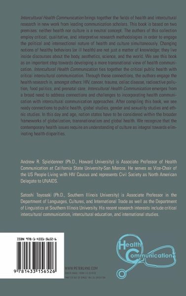 "Spieldenner and Toyosaki's Intercultural Health Communication is a much needed and ground-breaking resource that disrupts the whiteness of health communication through compelling and intersectional case studies that center Other bodies and experiences by bringing to bear theories and methods of intercultural communication. This book brings together senior and up-and-coming scholars to address emerging issues in intercultural health communication." -Bernadette Marie Calafell, Professor and Chair, Critical Race and Ethnic Studies, Gonzaga University