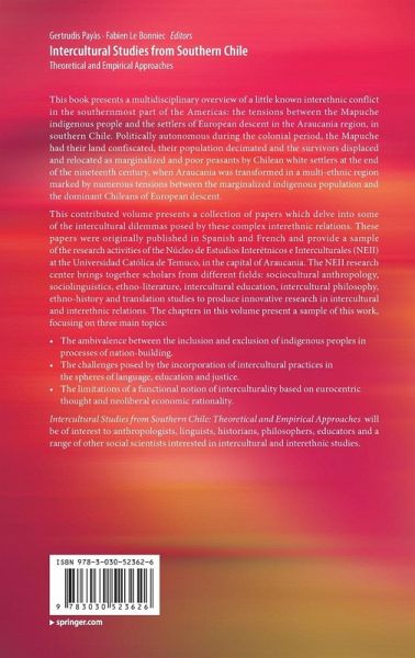 1. Commentary to Part I: Nineteenth-Century Araucania: Chileans, Settlers and Indians.- 2. In Pursuit of the Ideal Chilean Citizen: The Discursive Foundations of the Colonisation by Immigration of Araucania in the Nineteenth-Century.- 3. "As Truthful as it is Patriotic": The Dispute between Rodolfo Lenz and Manuel Manquilef over Translation.- 4. Commentary to Part II: Interdiscursivity and Interlegality as Key Dimen-sions of Intercultural Coexistence.- 5. Indigenous Juridicity and Cultural Differences. When Judges Discuss Cul-ture in Cases of Domestic Violence in the Mapuche Community Context (Chile).- 6. Meaningful Spaces for Language Socialisation in the Discourse of Mapuche Young People: A Qualitative Approach.- Episteme for Intercultural Dialogue between Mapuche Education and School Education.- 8. Commentary to Part III: Notes and Comments from the Perspective of the Liberating Intercultural Philosophy of 'Nuestra América' .- 9. Challenges for an Intercultural Democracy and Politics in the Chilean Wallmapu.- 10. The Endless Apogee of Interculturality: Critical Anthropological and Philosophical Reflections.- 11. Words, Relationality and Recognition: Apropos Axel Honneth.