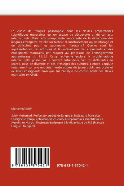 La classe de français philosophie dans les classes préparatoires scientifiques marocaines est un espace de découverte et de contacts interculturels. Mais cette composante importante de la didactique des langues étrangères est-elle un facteur d'enrichissement ou de blocage et de difficultés pour les apprenants marocains? Quelles sont les représentations, les attitudes et les interactions des apprenants et des enseignants marocains par rapport au processus de l'enseignement apprentissage du F.L.E.? Cette recherche explore la problématique interculturelle posée par le contact entre deux cultures différentes au Maroc, pays de diversité et des brassages des cultures. L'étude s'appuie notamment sur une enquête menée auprès du jeune public marocain et de leurs enseignants ainsi que sur l'analyse de corpus écrits des élèves marocains en CPGE.