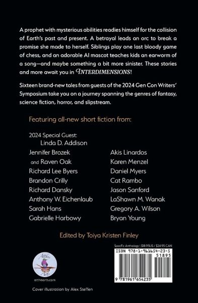 A prophet with mysterious abilities readies himself for the collision of Earth's past and present. A betrayal leads an orc to break a promise she made to herself. Siblings play one last bloody game of chess, and an adorable AI mascot teaches kids an earworm of a song-and maybe something a bit more sinister. These stories and more await you in Interdimensions! Sixteen brand-new tales from guests of the 2024 Gen Con Writers' Symposium take you on a journey spanning the genres of fantasy, science fiction, horror, and slipstream. Featuring all-new short fiction from: 2024 Special Guest Linda D. Addison, Jennifer Brozek and Raven Oak, Richard Lee Byers, Brandon Crilly, Richard Dansky, Anthony W. Eichenlaub, Sarah Hans, Gabrielle Harbowy, Akis Linardos, Karen Menzel, Daniel Myers, Cat Rambo, Jason Sanford, LaShawn M. Wanak, Gregory A. Wilson, Bryan Young