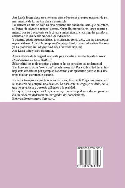 Ana Lucía Frega tiene tres ventajas para ofrecernos siempre material de primer nivel, y de forma tan clara y amigable. La primera es que no solo ha sido siempre una estudiosa, sino que ha estado al frente de alumnos mucho tiempo. Otra: ha merecido un largo reconocimiento por su trayectoria en la cátedra universitaria, y por algo ha ganado un asiento en la Academia Nacional de Educación. Además, desde su especialidad, la Música, ha construido, con los años, otras especialidades. Abarca la comprensión integral del proceso educativo. Por eso ya ha producido su Pedagogía del arte (Editorial Bonum). Ana Lucía sabe y sabe transmitir. Ahora el tema de la original propuesta para abordar el asunto de este libro es: ¿Inter o trans?...¿Co... Multi...? Saber cómo se ha de enseñar y cómo se ha de aprender es fundamental. Y el libro avanza con "olor a tiza" a cada momento. Por eso la mitad de su trabajo está construida por ejemplos concretos y de aplicación posible de la doctrina que tan claramente expone. En estos tiempos en que buscamos caminos, Ana Lucía Frega nos ofrece, con su maestría de siempre, uno de ellos. Lo hace con un lenguaje cuidado, bello, que no es elitista y que está adherido a la realidad. Nos quiere decir que con lo que somos y tenemos, podemos dar un paso hacia un modo verdadero integrador del conocimiento. Bienvenido este nuevo libro suyo. Julio César Labaké EDITORIAL BONUM ARGENTINA Este libro contiene el desarrollo de los siguientes temas, entre otros:¿inter o trans?... ¿co...multi...? Definiciones y un poco de historia práctica Aprendizaje: ¿por imitación...?, ¿por transferencia...?, ¿como un proceso interdisciplinar...? La inter-trans-co-multi... dos ejemplos La formación integral e integradora en acción... un ejemplo mexicano amplio Con este libro usted podrá conocer útiles herramientas para la práctica de la docencia. ¡Adquiera ya este libro y aproveche este completo trabajo académico!