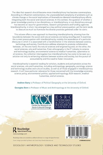 The idea that research should become more interdisciplinary has become commonplace. According to influential commentators, the unprecedented complexity of problems such as climate change or the social implications of biomedicine demand interdisciplinary efforts integrating both the social and natural sciences. In this context, the question of whether a given knowledge practice is too disciplinary, or interdisciplinary, or not disciplinary enough has become an issue for governments, research policy makers and funding agencies. Interdisciplinarity, in short, has emerged as a key political preoccupation; yet the term tends to obscure as much as illuminate the diverse practices gathered under its rubric. This volume offers a new approach to theorising interdisciplinarity, showing how the boundaries between the social and natural sciences are being reconfigured. It examines the current preoccupation with interdisciplinarity, notably the ascendance of a particular discourse in which it is associated with a transformation in the relations between science, technology and society. Contributors address attempts to promote collaboration between, on the one hand, the natural sciences and engineering and, on the other, the social sciences, arts and humanities. From ethnography in the IT industry to science and technology studies, environmental science to medical humanities, cybernetics to art-science, the collection interrogates how interdisciplinarity has come to be seen as a solution not only to enhancing relations between science and society, but the pursuit of accountability and the need to foster innovation. Interdisciplinarity is essential reading for scholars, students and policy makers across the social sciences, arts and humanities, including anthropology, geography, sociology, science and technology studies and cultural studies, as well as all those engaged in interdisciplinary research. It will have particular relevance for those concerned with the knowledge economy, science policy, environmental politics, applied anthropology, ELSI research, medical humanities, and art-science.