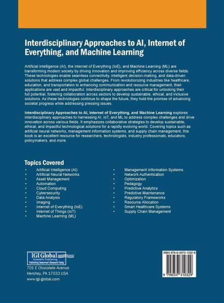 Artificial intelligence (AI), the Internet of Everything (IoE), and Machine Learning (ML) are transforming modern society by driving innovation and improving efficiency across diverse fields. These technologies enable seamless connectivity, intelligent decision-making, and data-driven solutions that address complex global challenges. From revolutionizing industries like healthcare, education, and transportation to enhancing communication and resource management, their applications are vast and impactful. Interdisciplinary approaches are critical for unlocking their full potential, fostering collaboration across sectors to develop sustainable, ethical, and inclusive solutions. As these technologies continue to shape the future, they hold the promise of advancing societal progress while addressing pressing issues. Interdisciplinary Approaches to AI, Internet of Everything, and Machine Learning explores interdisciplinary approaches to harnessing AI, IoT, and ML to address complex challenges and drive innovation across various fields. It emphasizes collaborative strategies to develop sustainable, ethical, and impactful technological solutions for a rapidly evolving world. Covering topics such as artificial neural networks, management information systems, and supply chain management, this book is an excellent resource for researchers, technologists, industry professionals, educators, policymakers, and more.