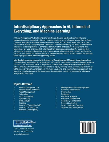 Artificial intelligence (AI), the Internet of Everything (IoE), and Machine Learning (ML) are transforming modern society by driving innovation and improving efficiency across diverse fields. These technologies enable seamless connectivity, intelligent decision-making, and data-driven solutions that address complex global challenges. From revolutionizing industries like healthcare, education, and transportation to enhancing communication and resource management, their applications are vast and impactful. Interdisciplinary approaches are critical for unlocking their full potential, fostering collaboration across sectors to develop sustainable, ethical, and inclusive solutions. As these technologies continue to shape the future, they hold the promise of advancing societal progress while addressing pressing issues. Interdisciplinary Approaches to AI, Internet of Everything, and Machine Learning explores interdisciplinary approaches to harnessing AI, IoT, and ML to address complex challenges and drive innovation across various fields. It emphasizes collaborative strategies to develop sustainable, ethical, and impactful technological solutions for a rapidly evolving world. Covering topics such as artificial neural networks, management information systems, and supply chain management, this book is an excellent resource for researchers, technologists, industry professionals, educators, policymakers, and more.
