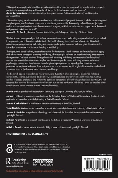 This book proposes a paradigm shift in how human and nonhuman well-being are perceived and approached. In response to years of accelerated decline in the health of ecosystems and their inhabitants, this edited collection presents planetary well-being as a new cross-disciplinary concept to foster global transformation towards a more equal and inclusive framing of well-being.
