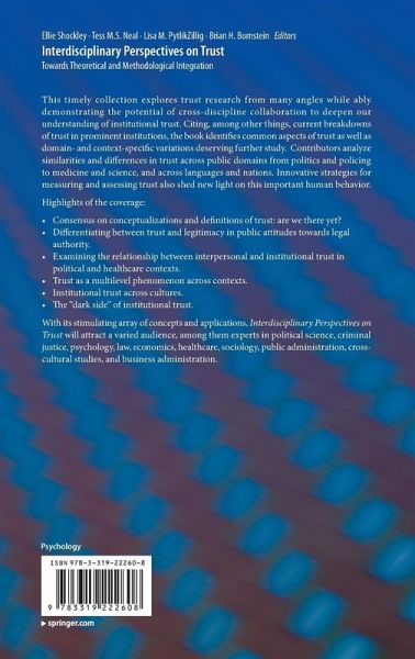 With its stimulating array of concepts and applications, Interdisciplinary Perspectives on Trust will attract a varied audience, among them experts in political science, criminal justice, psychology, law, economics, healthcare, sociology, public administration, cross-cultural studies, and business administration.