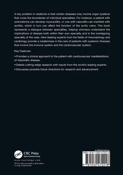 1. Approach to the Patient with Cardiac Manifestation of Rheumatic. 2. Fundamental Principles of Cardiac Imaging and Other Diagnostic Testing in Patients with Rheumatic Disease. 3.Rheumatoid Arthritis. 4. Spondyloarthritis. 5. Gout and Hyperuricemia in Cardiovascular Disease. 6.Osteoarthritis and Cardiovascular Disease: An Evolving Relationship. 7. Cardiovascular Disease in Systemic Lupus Erythematosus and Antiphospholipid Antibody Syndrome. 8. Sjogren's Syndrome. 9.Systemic Sclerosis.10. Idiopathic Inflammatory Myositis. 11. Vasculitis. 12. Preventive Cardiac Health for the Rheumatologist. 13. Future Directions for Cardio-Rheumatology