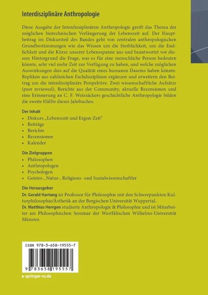 Diese Ausgabe der Interdisziplinären Anthropologie greift das Thema der möglichen biotechnischen Verlängerung der Lebenszeit auf. Der Hauptbeitrag im Diskursteil des Bandes geht von zentralen anthropologischen Grundbestimmungen wie das Wissen um die Sterblichkeit, um die Endlichkeit und die Kürze unserer Lebensspanne aus und beantwortet vor diesem Hintergrund die Frage, was es für eine menschliche Person bedeuten könnte, sehr viel mehr Zeit zur Verfügung zu haben, und welche möglichen Auswirkungen dies auf die Qualität eines humanen Daseins haben könnte. Repliken aus zahlreichen Fachdisziplinen ergänzen und erweitern den Beitrag um die interdisziplinäre Perspektive. Zwei wissenschaftliche Aufsätze (peer reviewed), Berichte aus der Community, aktuelle Rezensionen und eine Erinnerung an C. F. Weizsäckers geschichtliche Anthropologie bilden die zweite Hälfte dieses Jahrbuches.