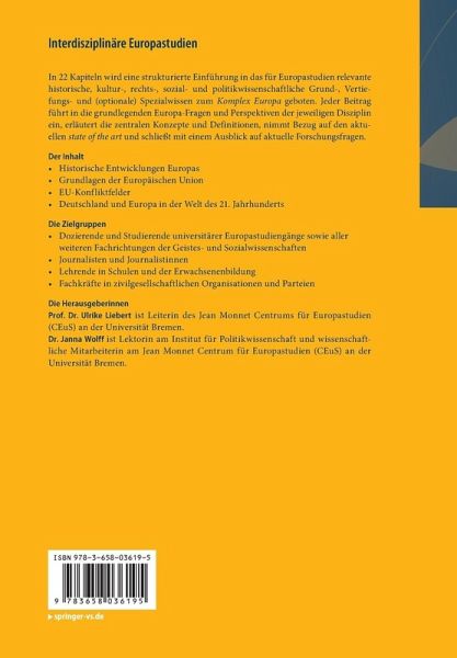 In 22 Kapiteln wird eine strukturierte Einführung in das für Europastudien relevante historische, kultur-, rechts-, sozial- und politikwissenschaftliche Grund-, Vertiefungs- und (optionale) Spezialwissen zum Komplex Europa geboten. Jeder Beitrag führt in die grundlegenden Europa-Fragen und Perspektiven der jeweiligen Disziplin ein, erläutert die zentralen Konzepte und Definitionen, nimmt Bezug auf den aktuellen state of the art und schließt mit einem Ausblick auf aktuelle Forschungsfragen.