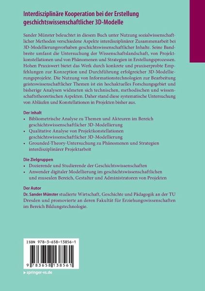 SanderMünster beleuchtet in diesem Buch unter Nutzung sozialwissenschaftlicherMethoden verschiedene Aspekte interdisziplinärer Zusammenarbeit bei3D-Modellierungsvorhaben geschichtswissenschaftlicher Inhalte. Seine Bandbreiteumfasst die Untersuchung der Wissenschaftslandschaft, vonProjektkonstellationen und von Phänomenen und Strategien inErstellungsprozessen. Hohen Praxiswert bietet das Werk durch konkrete undpraxiserprobte Empfehlungen zur Konzeption und Durchführung erfolgreicher3D-Modellierungsprojekte. Die Nutzung von Informationstechnologien zurBearbeitung geisteswissenschaftlicher Themen ist ein hochaktuelles Forschungsgebietund bisherige Analysen widmeten sich technischen, methodischen undwissenschaftstheoretischen Aspekten. Daher stand diese systematischeUntersuchung von Abläufen und Konstellationen in Projekten bisher aus.
