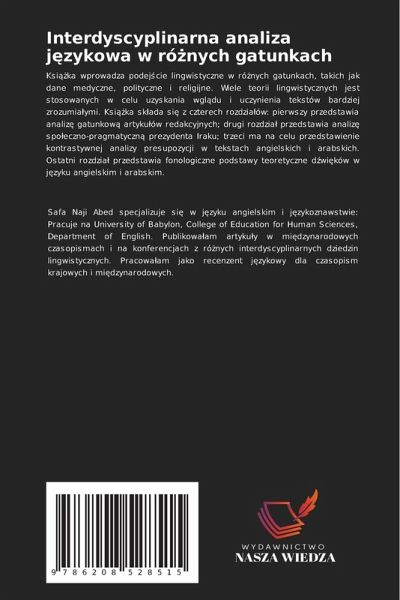 Ksi¿¿ka wprowadza podej¿cie lingwistyczne w ró¿nych gatunkach, takich jak dane medyczne, polityczne i religijne. Wiele teorii lingwistycznych jest stosowanych w celu uzyskania wgl¿du i uczynienia tekstów bardziej zrozumiäymi. Ksi¿¿ka sk¿ada si¿ z czterech rozdziäów: pierwszy przedstawia analiz¿ gatunkow¿ artyku¿ów redakcyjnych; drugi rozdziä przedstawia analiz¿ spo¿eczno-pragmatyczn¿ prezydenta Iraku; trzeci ma na celu przedstawienie kontrastywnej analizy presupozycji w tekstach angielskich i arabskich. Ostatni rozdziä przedstawia fonologiczne podstawy teoretyczne d¿wi¿ków w j¿zyku angielskim i arabskim.