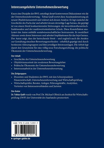 Kaum eine Disziplin der BWL unterliegt derart kontroversen Diskussionen wie die der Unternehmensbewertung - Tobias Quill wertet diese Auseinandersetzung als neuen Objektivismusstreit und widmet sich dessen Analyse. Er legt zunächst die Geschichte des Fachs dar und arbeitet dessen derzeitige Lage heraus, die geprägt ist von einem Streit konkurrierender Strömungen: der investitionstheoretisch-funktionalen und der marktwertorientierten Schule. Diese Konstellation analysiert der Autor mithilfe sozialwissenschaftlicher Instrumente. Er modelliert Akteure sowie deren Interessen und arbeitet Implikationen für das Sujet heraus. Der Autor zeigt, dass der herrschende Streit - und zugleich auch die Ansätze zur Gestaltung einzelner Bewertungsmethoden - erheblich geprägt sind durch bestimmte Akteursgruppen und ihre jeweiligen Interessenlagen. Die Arbeit legt damit den Grundstein für eine völlig neue Forschungsrichtung: die politische Ökonomie der Unternehmensbewertung.
