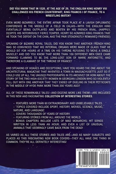 Did you know that in 1520, at the age of 29, the English king Henry VIII challenged his French counterpart, King Francis I of France, to a wrestling match? Even more bizarrely, the entire affair took place at a lavish diplomatic conference in the middle of a field in Calais-with the English king eventually being outplayed and beaten by his French rival. (Happily, despite his notoriously fierce temper, Henry so admired King Francis that he took the defeat on the chin, and the pair steadfastly remained good friends!) Speaking of bizarre royal tales, did you know that another French king was so convinced that his internal organs were made of glass that he would sit for hours at a time on his throne, refusing to move a single muscle? And did you know that more than 100 different men once came forward claiming to be the long-lost son of Marie Antoinette, and therefore a claimant of the throne of France? And speaking of hoaxes and deceptions, have you heard the one about the architectural magazine that invented a town in Massachusetts just so it could use up all the unused photographs in its archive? Or how about the story of the two high-society women in Georgian London who so violently fell out with one another that they ended up dueling in their petticoats in the middle of Hyde Park more than 200 years ago? All of these remarkable tales-and dozens more like them!-are included in this new and fascinating collection of INTERESTING STORIES. ¿ Features more than 60 extraordinary and unbelievable tales ¿ Topics covered include sport, history, movies, science, music, nature, and language ¿ Covers thousands of years of history ¿ Featuring stories from all around the world ¿ Bonus chapters include lists of mad monarchs, hit songs written in less than an hour, and even a list of unusual animals that seemingly came back from the dead! As varied as all these stories and tales are-and as many subjects and places as this fascinating new book covers-they all have one thing in common. They're all definitely interesting!