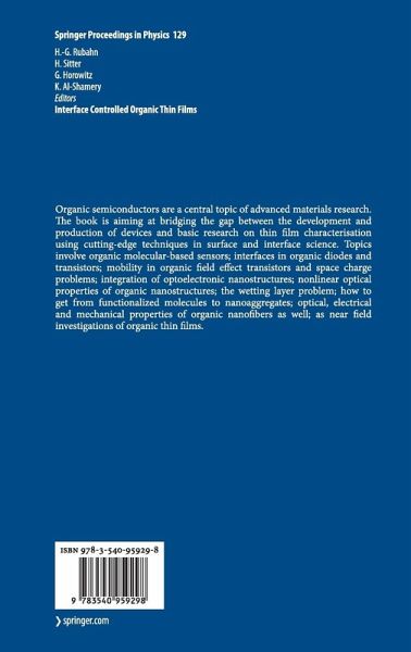 Organic semiconductors are a central topic of advanced materials research. The book is aiming at bridging the gap between the development and production of devices and basic research on thin film characterisation using cutting-edge techniques in surface and interface science. Topics involve organic molecular-based sensors; interfaces in organic diodes and transistors; mobility in organic field effect transistors and space charge problems; integration of optoelectronic nanostructures; nonlinear optical properties of organic nanostructures; the wetting layer problem; how to get from functionalized molecules to nanoaggregates; optical, electrical and mechanical properties of organic nanofibers as well; as near field investigations of organic thin films.