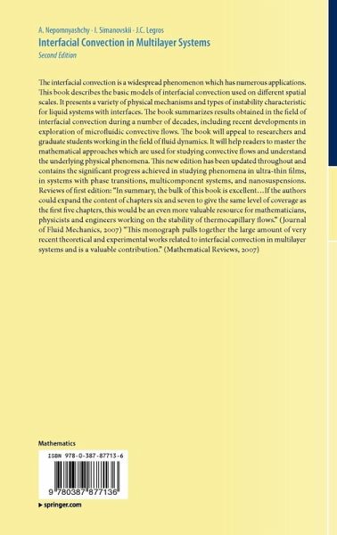 "This book provides a fundamental and comprehensive presentation of physical and mathematical principles of interfacial convection in multilayer systems, pointing out the most important practical applications. The book is well written and readable. ... The book will be of interest and useful to a wide range of specialists working in fluid dynamics, heat and mass transfer and applied mathematics, such as university students, graduate students, design engineers, physicists, chemical engineers, and also researchers interested in the mathematical theory of interfacial convection in multilayersystems." (Ioan Pop, Zentralblatt MATH, Vol. 1237, 2012)