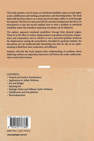 This book presents a set of essays on interfacial instability, essays that are linked by a common question and a common focus: the question of the stability of a liquid jet and a focus on the surface tension acting at the interface between two phases. The discussion is analytic rather than numerical. The first two essays provide the necessary background; the remaining seven essays lead logically from these to the treatment of a series of applications, including inviscid and viscous fluids, the effects of rotation and the stability of freezing and melting fronts. The discussion is, for the most part, limited to problems that can be solved analytically, and thus to linear problems. The techniques used to analyze the problems can, however, be generalized to nonlinear problems and numerical methods. Intended for graduate students and researchers in fluid mechanics, the treatment assumes some knowledge of fluid mechanics. Students whose research problems involve multi-phase flows willfind the concepts in this manuscript to be helpful in describing boundary conditions for their formulations.