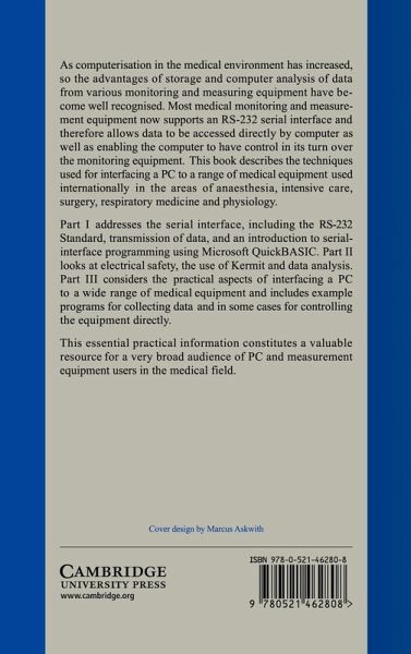 As computerisation in the medical environment has increased, so the advantages of storage and computer analysis of data from various monitoring and measuring equipment have become well recognised. Most medical monitoring and measurement equipment now supports an RS-232 serial interface and therefore allows data to be accessed directly by computer as well as enabling the computer to have control in its turn over the monitoring equipment. This book describes the techniques used for interfacing a PC to a range of medical equipment used internationally in the areas of anaesthesia, intensive care, surgery, respiratory medicine and physiology. This essential practical information constitutes a valuable resource for a very broad audience of PC and measurement equipment users in the medical field.