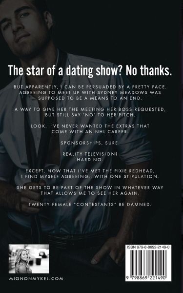 Be the star of a dating show? No thanks. But apparently, I can be persuaded by a pretty face. Agreeing to meet up with Sydney Meadows was supposed to be a means to an end. A way to give her the meeting her boss requested, but still say 'no' to her pitch. Look, I've never wanted the extras that come with an NHL career. Sponsorships, sure. Reality television? Hard no. Except-now that I've met the pixie redhead-I find myself agreeing...with one stipulation. She gets to be part of the show in whatever way that allows me to see her again. Twenty female "contestants" be damned.