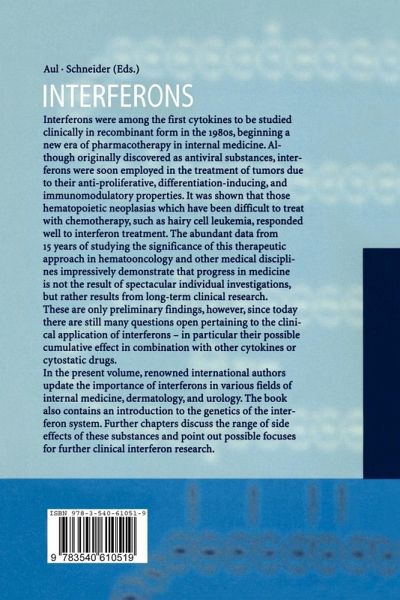 Interferons were among the first cytokines to be studied clinically in recombinant form in the 1980s, beginning a new era of pharmacotherapy in internal medicine. Interferons were soon employed in the treatment of tumors and it was shown that those hematopoietic neoplasias which had been difficult to treat with chemotherapy responded well to interferon treatment. In the present volume, renowned international authors update the importance of interferons in various fields of internal medicine, dermatology, and urology. The book also contains a general introduction into the classification, structure, and mode of action of interferons. Further chapters discuss the range of side effects of these substances and point out possible focuses of further clinical interferon research.