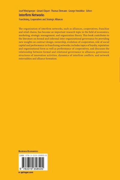 The organization of interfirm networks, such as alliances, cooperatives, franchise and retail chains, has become an important research topic in the field of economics, marketing, strategic management, and organization theory. This book contributes to the literature on formal and informal inter-organizational governance by providing new insights on contract design, ownership, evolution of cooperation, role of social capital and performance in franchising networks; includes topics of loyalty, reputation and organizational form as well as performance of cooperatives, and discusses the relationship between formal and relational governance in alliances, governance structures of innovation activities, dynamics of interfirm conflicts, and network externalities and alliance formation.