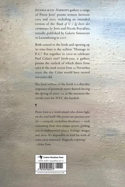 Interglacial Narrows gathers a range of Pierre Joris' poems written between 2015 and 2021, including an extended version of the Book of U / Le livre des cormorans by Joris and Nicole Peyrafitte, initially published by Galerie Simoncini in Luxembourg in 2017. Both central to the book and opening up its time-lines is the section "Homage to P.C." Put together in 2020 to celebrate Paul Celan's 100th birth-year, it gathers poems the earliest of which dates from 1969 & the most recent from 23 November 2020, the day Celan would have turned 100 years old. The final section of the book is a diaristic sequence of poems & notes started during the spring of 2020, i.e. at the moment the covid-crisis hit NYC the hardest.