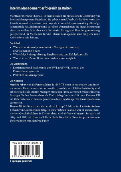 Manfred Faber und Thomas Til thematisieren die professionelle Gestaltung von Interim Management Projekten. Sie geben einen Überblick darüber, wann der Einsatz sinnvoll ist und wie man Projekte so aufsetzt, dass man den größtmöglichen Erfolg hat. Zielgruppe sind vor allem Unternehmen, die dieses Instrument einsetzen wollen. Es ist aber auch für Interim Manager als Handlungsanweisung geeignet und für Menschen, für die Interim Management eine mögliche neue Arbeitsform sein könnte.