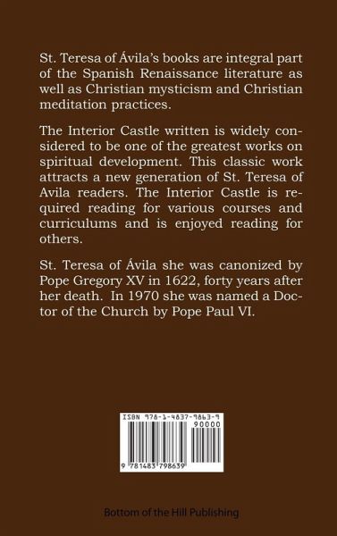 St. Teresa of Avila's books are an integral part of the Spanish Renaissance literature as well as Christian mysticism and Christian meditation practices. The Interior Castle as written is widely considered to be one of the greatest works on spiritual development. This classic work attracts a new generation of St. Teresa of Avila readers. The Interior Castle is required reading for various college courses and curriculums and is enjoyed reading for many others. St. Teresa of Avila was canonized by Pope Gregory XV in 1622, forty years after her death. In 1970 St. Teresa was named a Doctor of the Church by Pope Paul VI.