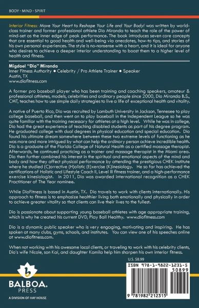 Interior Fitness: Move Your Heart to Reshape Your Life and Your Body! was written by world-class trainer and former professional athlete Dio Miranda to teach the role of the power of mind-set as the inner edge of peak performance. The book introduces seven core concepts that are essential to good health and well-being via anecdotes, how-to tips, and stories of his own personal experiences. The style is no-nonsense with a heart, and it is ideal for anyone who desires to achieve a deeper interior understanding to boost them to a higher level of health and fitness.