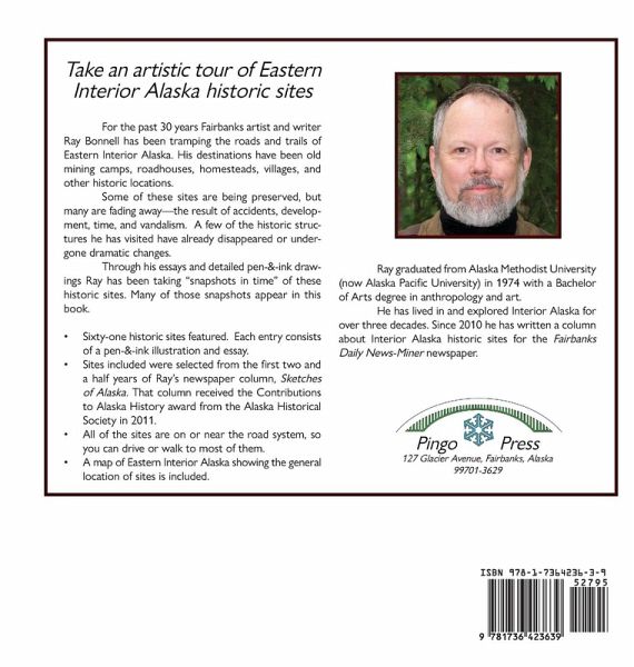 Take an artistic tour of Eastern Interior Alaska historic sites. For the past 30 years Fairbanks artist and writer Ray Bonnell has been tramping the roads and trails of Eastern Interior Alaska. His destinations have been old mining camps, roadhouses, homesteads, villages, and other historic locations. Some of these sites are being preserved, but many are fading away-the result of accidents, development, time, and vandalism. A few of the historic structures he has visited have already disappeared or undergone dramatic changes. Through his essays and detailed pen-&-ink drawings Ray has been taking "snapshots in time" of these historic sites. Many of those snapshots appear in this book. Sixty-one historic sites featured. Each entry consists of a pen-&-ink fine-art illustration and essay. Sites included were selected from the first two and a half years of Ray's newspaper column, "Sketches of Alaska." That column received the Contributions to Alaska History award from the Alaska Historical Society in 2011. All of the sites are on or near the road system, so you can drive or walk to most of them. A map of Eastern Interior Alaska showing the general location of sites is included.