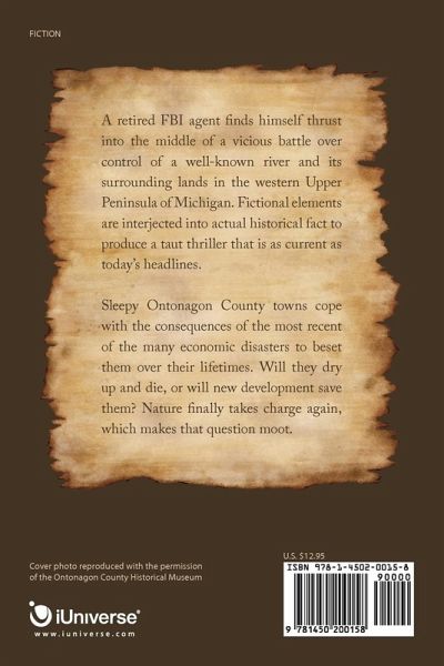 A retired FBI agent fi nds himself thrust into the middle of a vicious battle over control of a well-known river and its surrounding lands in the western Upper Peninsula of Michigan. Fictional elements are interjected into actual historical fact to produce a taut thriller that is as current as today's headlines. Sleepy Ontonagon County towns cope with the consequences of the most recent of the many economic disasters to beset them over their lifetimes. Will they dry up and die, or will new development save them? Nature finally takes charge again, which makes that question moot.