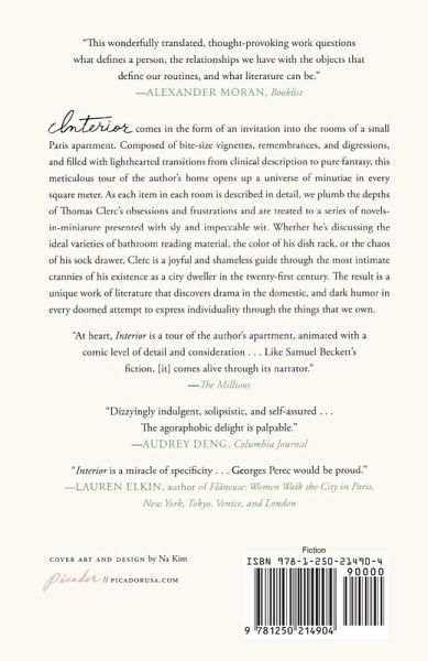 "Haunting, a book of ghosts and a book of this moment." -Parul Sehgal, The New York Times A comic experiment in sociology and self-absorption, the award-winning author Thomas Clerc's autobiographical Interior is a unique invitation into a professor's preoccupations and possessions within the rooms of a small Parisian apartment. Composed of bite-size vignettes, remembrances, and digressions, and filled with lighthearted transitions from pure description to quirky reminiscence and back, this meticulous tour through the rooms of Clerc's home reveals fascinating insights into the author's obsessions, desires, and frustrations. Each space is described in painstaking detail, sometimes down to the centimeter, and the history of every object and appliance is fully excavated with self-deprecating wit. From the ideal varieties of bathroom reading material to the color of his dish rack to the chaos of his sock drawer, Clerc happily and shamelessly guides us through the most intimate crannies of his home, as well as through all the strata of his existence as a bourgeois city dweller approaching middle age. Playful and irreverent, as well as a sly commentary on materialism, Interior finds drama in the domestic and dark humor in every doomed attempt to express individuality through the things that we own.