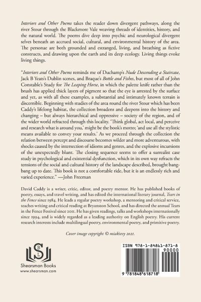 Interiors and Other Poems takes the reader down divergent pathways, along the river Stour through the Blackmore Vale weaving threads of identities, history, and the natural world. The poems dive deep into psychic and neurological divergent selves beneath an accrued social, cultural, and environmental history of the area. The personae are both grounded and estranged, living, and breathing as fictive constructs, and drawing upon the earth and its deep ecology. Living things evoke living things. "Interiors and Other Poems reminds me of Duchamp's Nude Descending a Staircase, Jack B Yeats's Dublin scenes, and Braque's Bottle and Fishes, but most of all of John Constable's Study for The Leaping Horse, in which the palette knife rather than the brush has applied thick layers of pigment so that the eye is arrested by the surface and yet, as with all these examples, a substantial and intimately known terrain is discernible. Beginning with studies of the area round the river Stour which has been Caddy's lifelong habitat, the collection broadens and deepens into the history and changing - but always hierarchical and oppressive - society of the region, and of the wider world refracted through this locality. 'Think global, act local, and perceive and research what is around you,' might be the book's motto; 'and use all the stylistic means available to convey your results.' As we proceed through the collection the relation between percept and discourse becomes wilder and more adventurous, with shocks caused by the intersection of idioms and genres, and the explosive incursions of the unexpectedly blunt. The closing sequence seems to offer a surrealist case study in psychological and existential dysfunction, which in its own way refracts the tensions of the social and cultural history of the landscape described, brought bang-bang up to date. This book is not a comfortable ride, but it is an endlessly rich and varied experience." -John Freeman