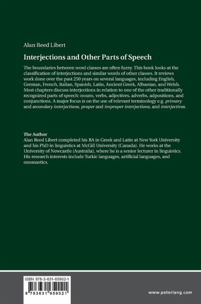 The boundaries between word classes are often fuzzy. This book looks at the classification of interjections and similar words of other classes. It reviews work done over the past 250 years on several languages, including English, German, French, Italian, Spanish, Latin, Ancient Greek, Albanian, and Welsh. Most chapters discuss interjections in relation to one of the other traditionally recognized parts of speech: nouns, verbs, adjectives, adverbs, adpositions, and conjunctions. A major focus is on the use of relevant terminology e.g. primary and secondary interjections, proper and improper interjections, and interjectives.