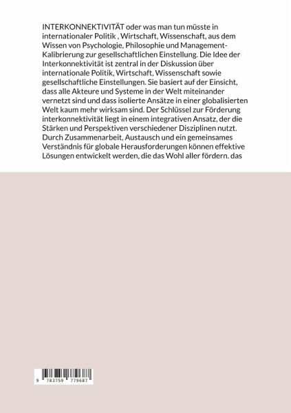 INTERKONNEKTIVITÄT oder was man tun müsste in internationaler Politik, Wirtschaft, Wissenschaft, aus dem Wissen von Psychologie, Philosophie und Management-Kalibrierung zur gesellschaftlichen Einstellung. Die Idee der Interkonnektivität ist zentral in der Diskussion über internationale Politik, Wirtschaft, Wissenschaft sowie gesellschaftliche Einstellungen. Sie basiert auf der Einsicht, dass alle Akteure und Systeme in der Welt miteinander vernetzt sind und dass isolierte Ansätze in einer globalisierten Welt kaum mehr wirksam sind. Der Schlüssel zur Förderung Interkonnektivität liegt in einem…mehr