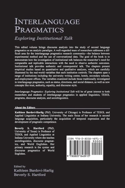 Contents: K. Bardovi-Harlig B.S. Hartford Introduction. K. Bardovi-Harlig B.S. Hartford Institutional Discourse and Interlanguage Pragmatics Research. J. Williams Writing Center Interaction: Institutional Discourse and the Role of Peer Tutors. L. Yates Negotiating an Institutional Identity: Individual Differences in NS and NNS Teacher Directives. J. Kerekes Before During and After the Event: Getting the Job (or Not) in an Employment Interview. C.E. Davies A.E. Tyler Discourse Strategies in the Context of Crosscultural Institutional Talk: Uncovering Interlanguage Pragmatics in the University Classroom. E. Tarone English for Specific Purposes and Interlanguage Pragmatics. T. Gibbs Using Moves in the Opening Sequence to Identify Callers in Institutional Settings. K. Bardovi-Harlig B.S. Hartford Practical Considerations.