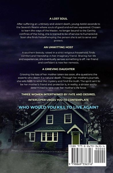 A LOST SOULAfter suffering an untimely and violent death, young Astrid ascends to the Seventh Realm where souls of good and evil are separated. Chosen to learn the ways of the Master, no longer bound to the Earthly confines of the living, she is trained to be of service to humankind. Soon she finds herself envying the person she is set to serve and protect. AN UNWITTING HOSTA southern beauty, raised in a strict religious household, finds comfort and friendship in her imaginary friend. Sharing her life and experiences, she eventually senses something is off. Her friend and confidant is now her nemesis.A GRIEVING DAUGHTERGrieving the loss of her mother taken too soon, she questions the experts who deem it a natural death. Through her mother's journals, she sets forth to solve the mystery and find the truth. The spirit sent to be her mother's friend and protector is, in reality, a sinister entity determined to take over her mother's life force.THREE WOMEN INTERTWINED BY FATE AND DESIRES.INTERLOPER URGES YOU TO CONTEMPLATE WHO WOULD YOU KILL TO LIVE AGAIN?