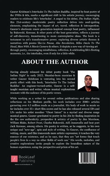 Having already released his debut poetry book 'The Indian Night' in early 2022, Mumbai-born musician & writer Gaurav Krishnan is venturing into his second poetic effort with this book, 'Interludes To The Indian Buddha'. An engineer-turned-artist, Gaurav is a self-taught musician and writer, whose musical explorations resonate with the cadence of his poetic verses. While working as a writer for several online publications and also sharing reflections on his Medium profile, his work includes over 2000+ articles garnering over 4.5 million reads as a journalist. His body of work in music so far includes over 35+ short film scores and he has also released several EPs and LPs under his artist moniker ""Ghost Intent"" in a myriad and diverse range musical genres. Gaurav gravitated to poetry in his 20s by finding inspiration in the the raw authenticity, perspective & artistry of poetry by Jim Morrison, William Blake, Robert Frost, Charles Bukowski, Adil Jussawalla and beat poet Jack Kerouac, among others. His poetry is written, as he suggests, in his own unique and ""new-age"", spin and style of writing. To Gaurav, the confluence of writing, music, and film transcends mere artistic expression; it touches the very essence of our existence, and as he says, that they are ""art forms that touch people's lives in a way no other fields of work can."" His words, melodies, and creative explorations invite people to explore the boundless nature of the human experience, using the perspective and prism of his art.