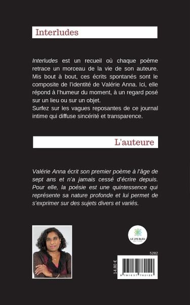 Interludes est un recueil où chaque poème retrace un morceau de la vie de son auteure. Mis bout à bout, ces écrits spontanés sont le composite de l'identité de Valérie Anna. Ici, elle répond à l'humeur du moment, à un regard posé sur un lieu ou sur un objet. Surfez sur les vagues reposantes de ce journal intime qui diffuse sincérité et transparence.