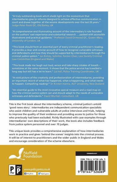 This is the first book about the intermediary scheme, criminal justiceâ s untold â good news storyâ . It provides a comprehensive explanation of how intermediaries work in practice and gives â behind the scenesâ insights into the criminal process. It will be of interest to practitioners and the wider public.